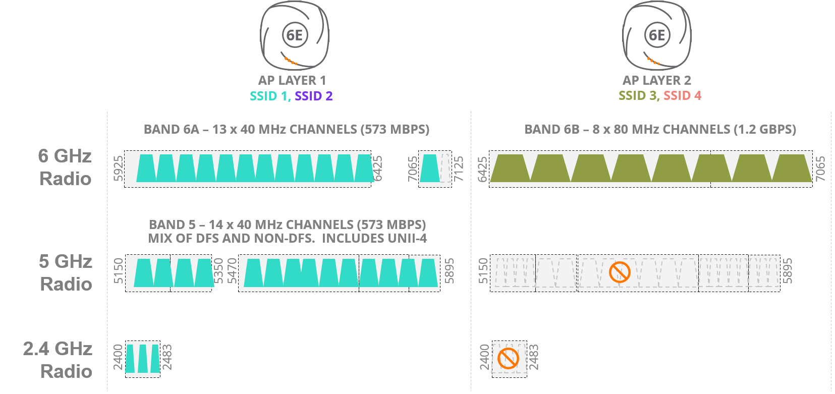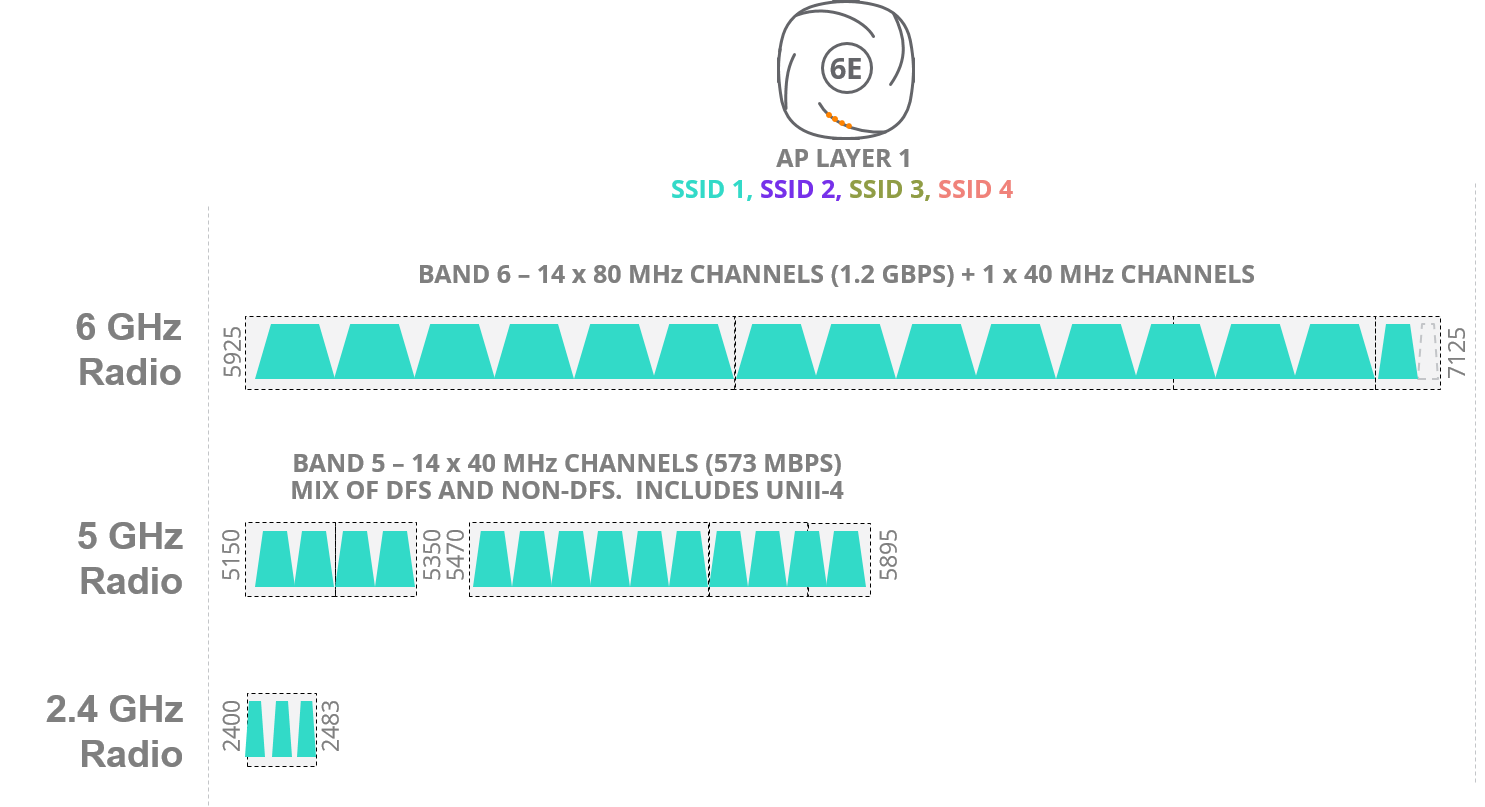 大多数进入prises that deploy tri-band Wi-Fi 6E access points will simply replace existing infrastructure, adding a third radio and treating 6 GHz as a single new pool of capacity. SSID allocation may evolve as described above, but otherwise this continues the longstanding practice in the enterprise of treating each band as a capacity block. In terms of channels, that approach can be visualized as follows: