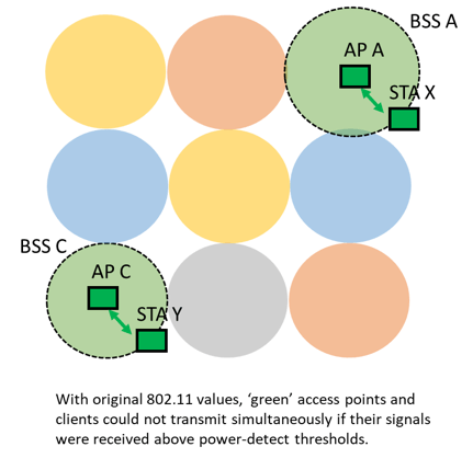 但是,相对较低的功率检测阈值定义为802.11ax,虽然有效地防止了空中的帧冲突,但降低了网络性能,超过了它的需要。以一栋办公大楼为例,大约60 - 80平方米。企业级WLAN可能使用16个接入点覆盖一层,以便以高数据速率为密集的客户端提供服务。但是,由于可用的40或80 MHz信道数量有限,一些接入点将需要在同一信道上。给定保守的功率检测阈值,同一信道上的任何接入点(或其客户端)都可以被其他信道听到。在这样一个通道中,即使它们位于大楼的相对角落,一次也只能有一个客户端或接入点进行传输。