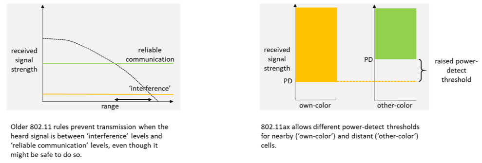附近接入点的定义是在其和其客户端传输中带有不同“颜色”标签的接入点。这个标签被添加到802.11ax前序中:为63个可能的值分配6位。当一个网络的颜色正确时,位于建筑物不同末端的细胞——以前它们会遵从彼此的CCA,因此在任何时候只有一个细胞可以传输——将能够同时传输,而不会引起更高的重传和错误率。