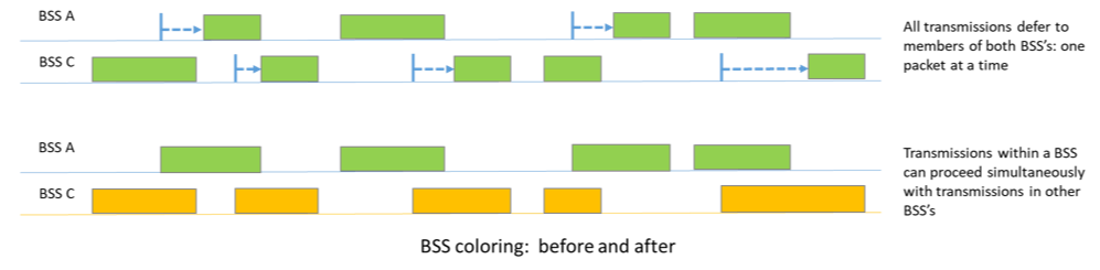 当两个或多个相邻但不相邻的接入点或设备能够在同一时间安全传输,而不造成相互干扰时,BSS的颜色可以识别。在802.11ax之前使用的通道访问协议不允许这些传输,但现在允许。