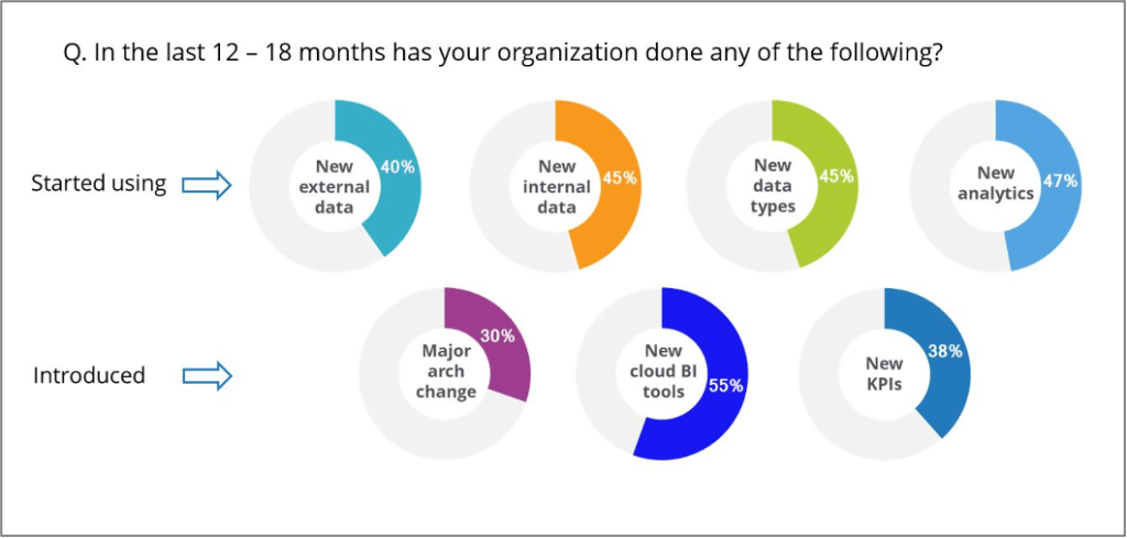 IDC最近对美国310家大中型企业的一项研究发现,很大一部分企业开始利用数据来影响业务运营。调查发现,40%的企业正在使用新的外部数据源,而另外45%已经开始使用新的内部数据源。这使得38%的公司在业务范围内创建了新的关键绩效指标(kpi), 55%的公司报告使用了新的基于云的商业智能工具。企业业务运营越来越依赖的数据资产更加细化、更加多样化、分布在更多地点。