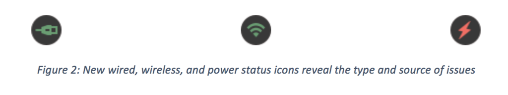 At first it may seem that information has been taken away because the traffic light status indicators have been reduced by one from five to four. You actually now receive more information because the Wi-Fi and Network information have been combined into a single status group. Icons to the right of each sensor convey whether any issue detected is due to a power failure, or if it is with the wired network, the wireless network, or both.