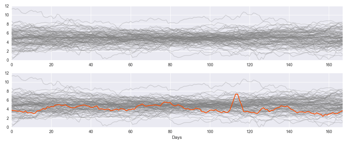 Image A: Detecting abnormalities across disparate data sets. When you see the orange line in the bottom panel of Image A, it highlights an obvious period of abnormality. But in the top panel, where it is grey like the other lines, you don't pick up the abnormal period. When you are making many measurements with different behaviour, it’s very difficult to manually define thresholds for detecting abnormal behavior. A better way is to look for anomalies programmatically, dynamically comparing sets of measurements to their own past behaviour.