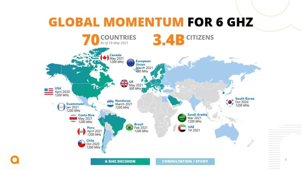 我们的Wi-Fi 6E ap将充分利用全球6ghz左右的势头。如下图所示,70个拥有34亿人口的国家已经批准或正在考虑6ghz法规。最引人注目的是,这个图表在不断变化,全球各国采用6ghz作为整个1200 MHz或更低的频段(480或500 MHz)。我们也看到了Wi-Fi 6E客户数量的大幅增长今年是3.38亿部到2022年,它们将占总出货量的20%。