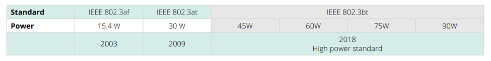 由于需要连接这些新兴的耗电设备,PoE技术随着PoE的引入而进步IEEE 802.3英国电信标准2018年9月。与专有技术不同,该标准确保了多供应商的兼容性,并允许网络交换机和安全摄像头等供电设备每个端口运行超过30瓦的PoE,并支持每个端口高达60瓦甚至90瓦的PoE。以下是PoE标准的进展情况: