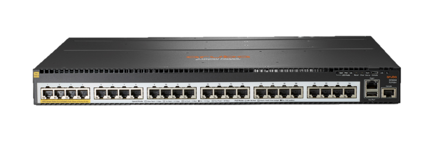 - Aruba 2930M (R0M68A) PoE Class 6 1-slot Switch with 24 x Smart Rate PoE(用于28个Smart Rate端口,使用可选的4端口模块)。支持的智能速率速率为1、2.5和5Gbps。