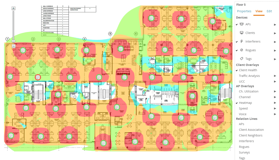 Monitoring and Managing the Client Experience最后,管理员必须有明确的可见性into the location of users and devices, including rogues or interference that could disrupt the quality of service. This is particularly important in a smart digital workplace, as the majority of users are on wireless connections. AirWave's integrated Site Assessment & Visibility feature puts this information at your fingertips, through a comprehensive mapping of RF heat-maps, access points, clients and devices, including suspected rogues and interferences. Floor plans can be imported as a background for location-based troubleshooting, providing administrators the ability to solve problems faster and more efficiently. One-click-based overlays add client health, application performance and channel utilization views to quickly diagnose issues in a given location, building or floor. Client location history and playback helps resolve issues as users move through the environment. The ability to plan for enhancements or upgrades is provided, which saves time and removes guesswork when IT makes changes that affect wireless quality and coverage. The result is a clear view of who is on the network, their locations and how the network and required resources are performing.