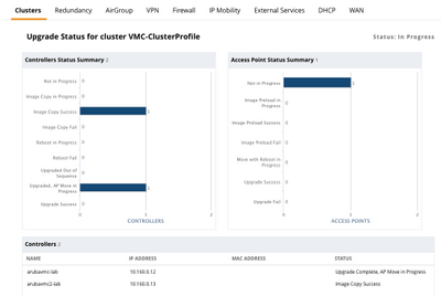 A true hitless failover from the client perspective is almost unfathomable to an engineer. While this process isn’t truly “hitless,” you will see the client associate to a neighboring AP when the controller decides it’s time for the currently associated AP to upgrade, it’s pretty close.Cluster Upgrade Status