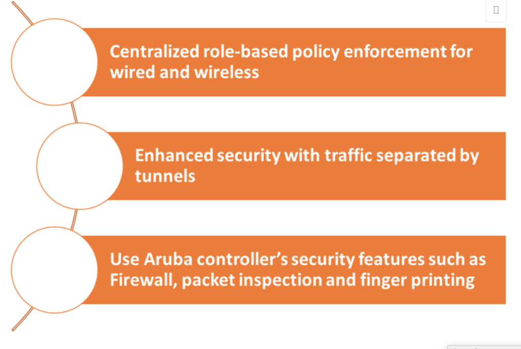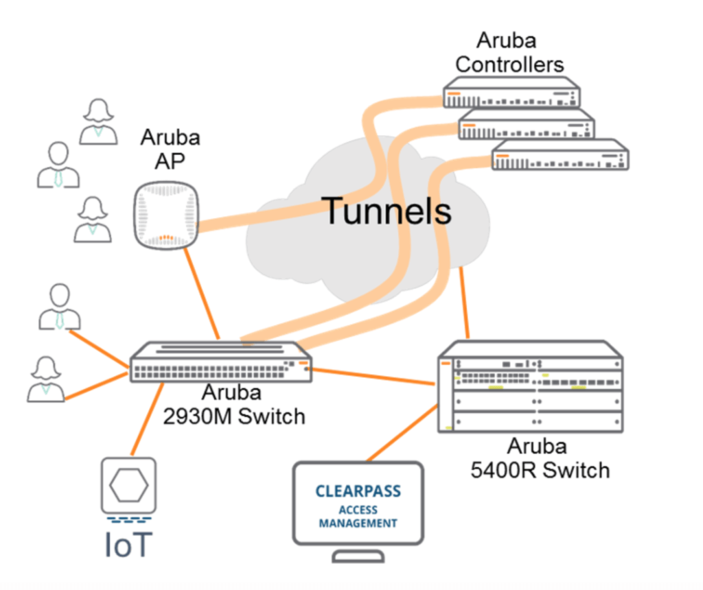 阿鲁巴岛控制器的使用作为一个统一的波利奇y enforcement point for traffic from both wired and wireless devices adds to the consistency of policies. Using a unified model that is centrally managed and enforced simplifies deployment and ensures consistent wired access and permissions as devices connect and disconnect. This allows an Aruba switch to act like a wired access point, so users or devices that connect to the switch are tunneled to the mobility controller and receive the same privileges and experience as when connected to the wireless network.
