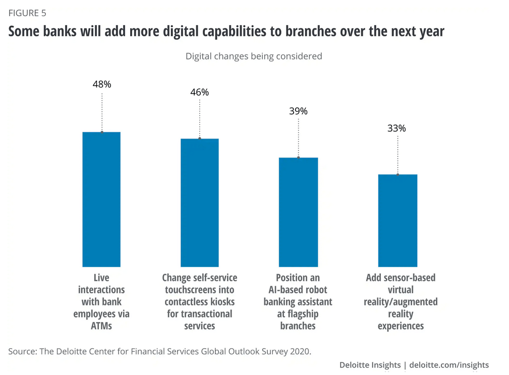 - 数字化和云迁移:随着云计算的出现,金融服务机构正在将其流程数字化,以提供更好的服务和更好的客户体验。这一趋势正在加速,主要有两个原因:一是COVID-19危机导致人员交流的非物质化,二是越来越多的金融科技初创企业与传统金融机构竞争日益激烈,它们提供新的数字服务,改善了客户体验。这一趋势不仅加速了面向客户的应用程序的云迁移,还加速了内部业务应用程序的云迁移。此外,随着数字服务的扩展,分支机构不再关注可以在线执行的简单交易,而是更多地关注改善分支机构客户体验的复杂操作。德勤最近的一项研究(来源:2021年银行业和资本市场展望,德勤,2020年12月),确实声称“近一半的受访者表示,他们所在的机构正在考虑通过atm机与银行工作人员进行实时互动,并安装自助服务、非接触式触摸屏。此外,银行还可以整合基于人工智能(AI)的银行助理和基于传感器的增强现实和虚拟现实体验。”