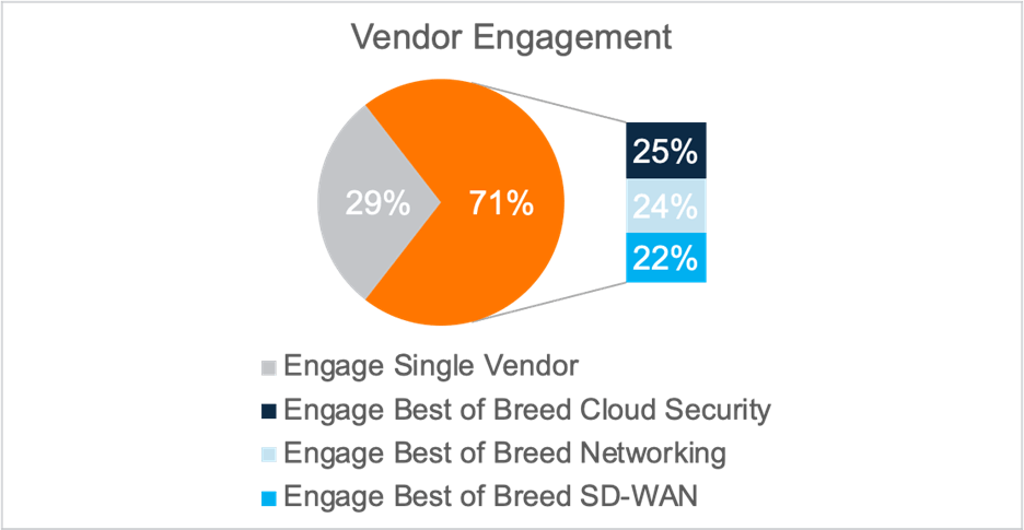 SASE服务可以在各种部署选项中消耗,如图1所示。这五个部署方案突出了服务提供商也能够提供管理的SD-WAN或管理云安全服务,并支持实施自己的企业(DIY)SD-WAN或云安全解决方案。最近Ponemon调查,如图2所示,71%的企业受访者将在部署SAS架构的SD-WAN和云传递的安全性时选择最好的品种供应商。