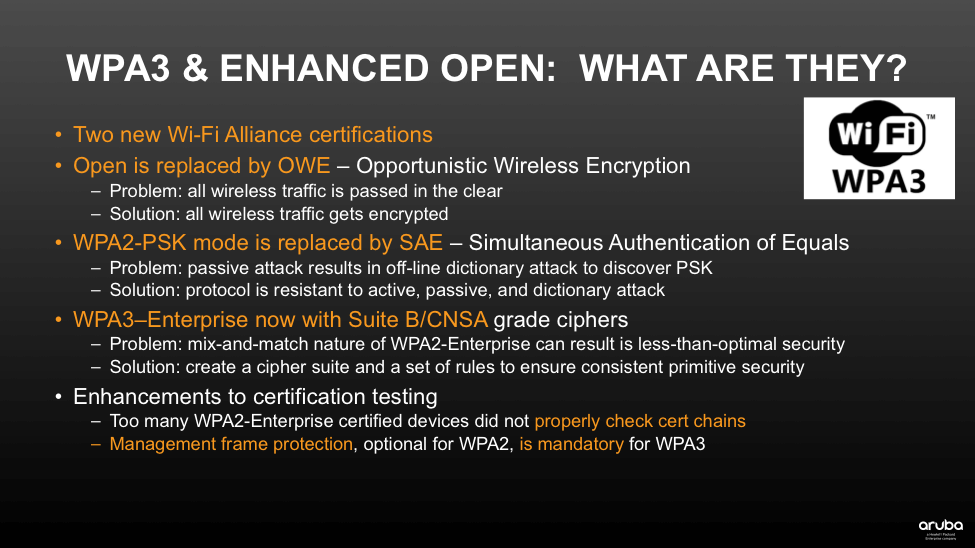 阿鲁巴最近在9月14日举办了世纪3日第3天,并利用机会深入了解Wi-Fi安全架构如何发展Wi-Fi认证WPA3™和Wi-Fi认证增强型开放™,Wi-Fi Alliance认证计划。阿鲁巴有刺激关于WPA3的行业讨论在过去的一年中,让我们来看看加强开放的承诺,以消除一次开放网络。