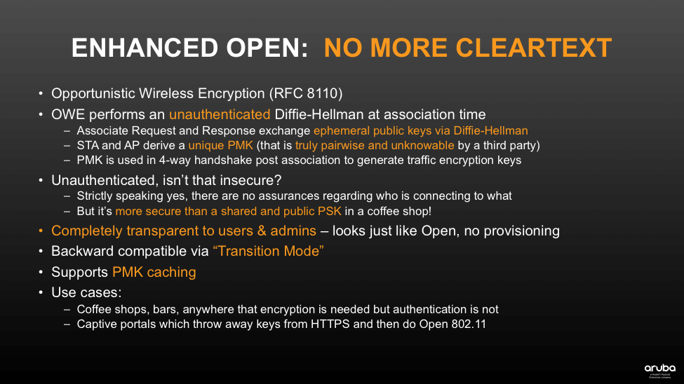 标准可以由委员会批准,但只有当领先的供应商——从Aruba这样的基础设施供应商,三星或苹果这样的客户端设备供应商,以及Marvell和Broadcom这样的芯片组制造商——交付技术,使其与主流相关时,标准才具有重要意义。因此,当我们回答“什么是OWE?”“无论是MFD3还是客户、合作伙伴和供应商——因为这是一个全新的领域,技术在不断发展,使事情变得更好、更安全。