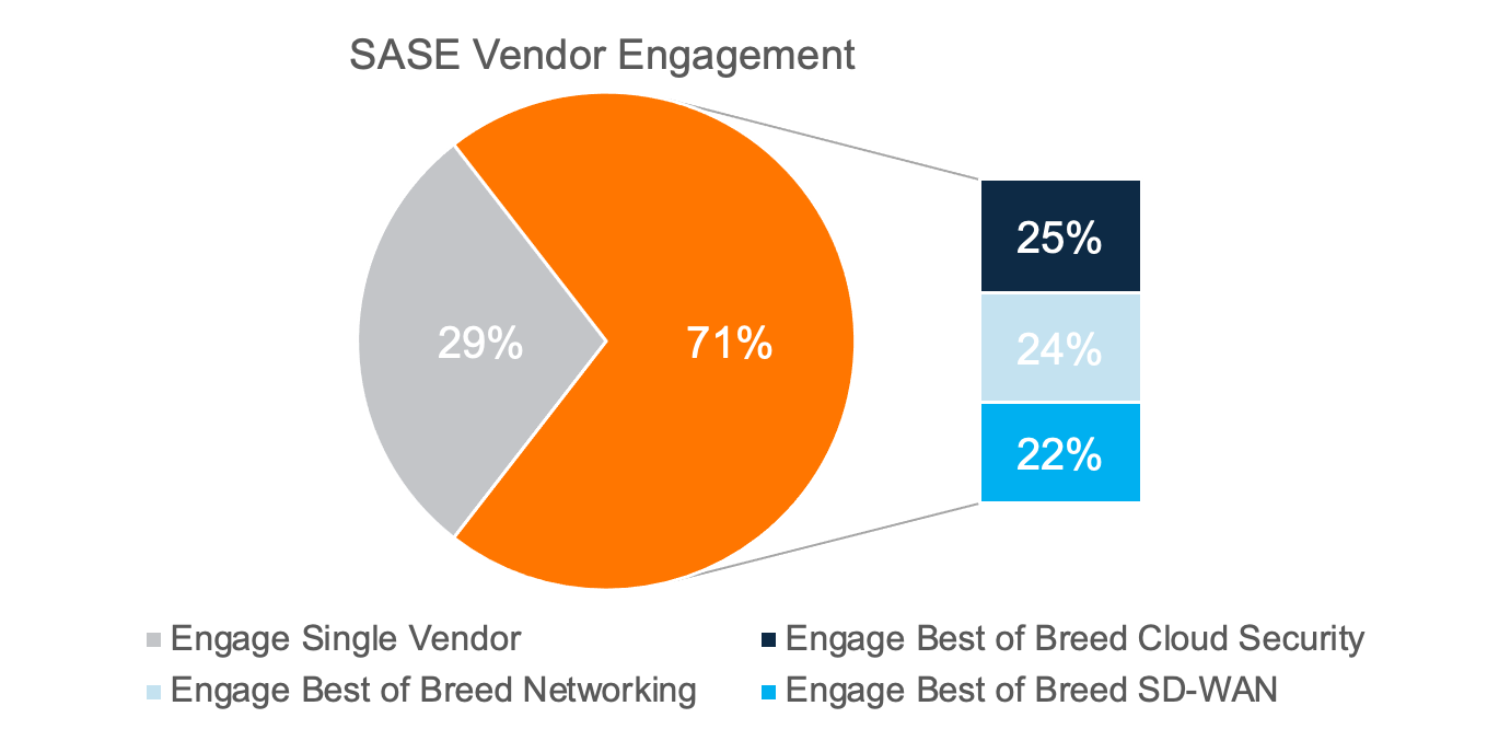根据最近的Ponemon Institute安全性最佳实践的结果,超过1800多个网络和安全IT专业人士,超过三分之二的IT团队希望采用Sase采用最好的网络和云安全。[1]超过70%的受访者赞成多供应商的集成,可以简化部署和正在进行的操作,而不会影响网络或安全功能。