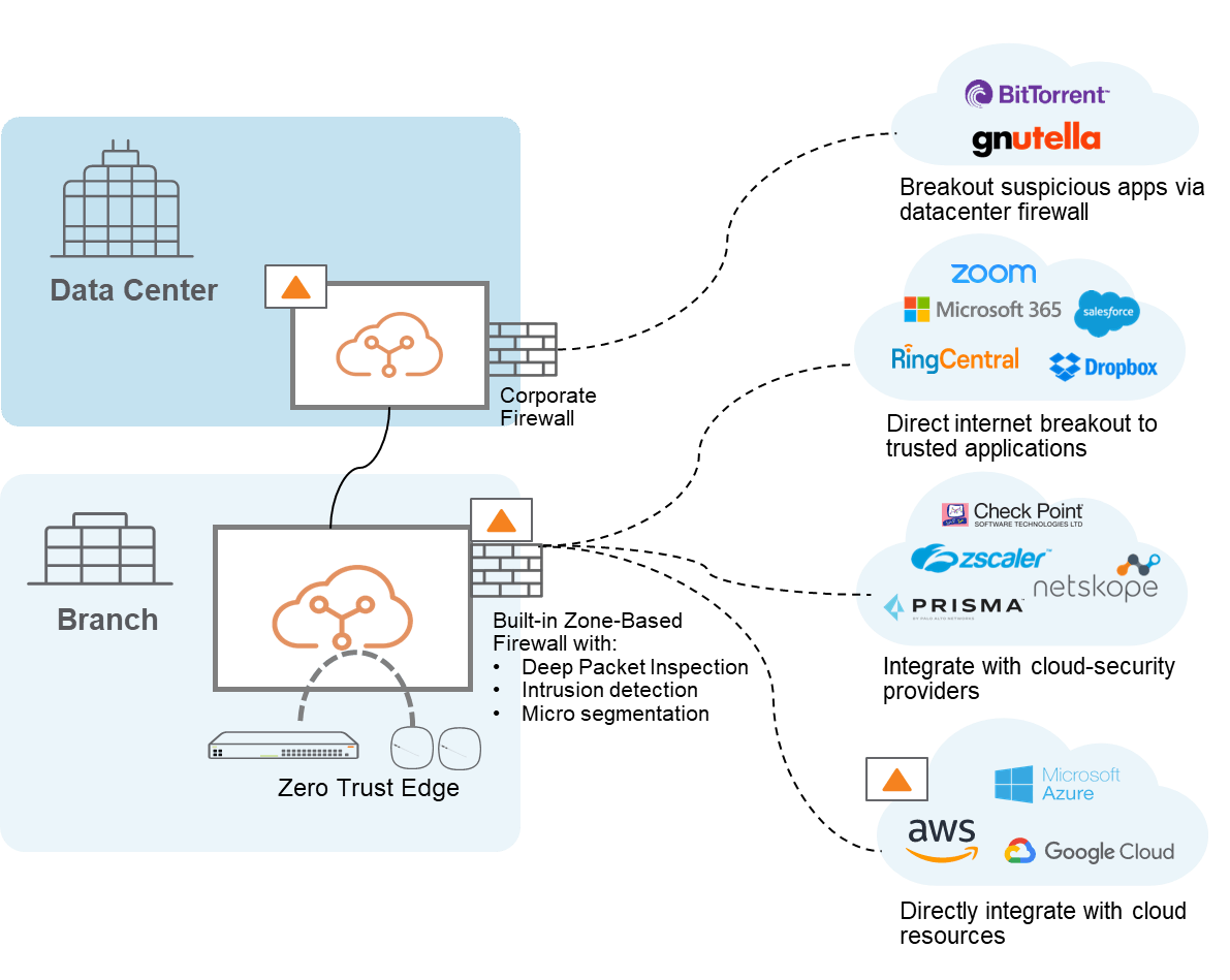 Aruba EdgeConnect通过整合基于角色的防火墙功能,为完整的SASE方法提供了基础。它与第三方云安全供应商本地集成,提供完全自动化的编制功能。这允许金融组织根据需求选择最佳SD-WAN提供商和最佳云安全提供商,同时可以轻松地从传统架构过渡到SASE架构。