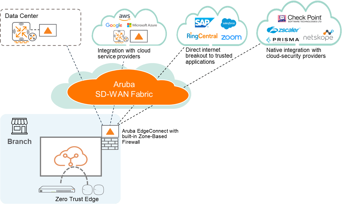 此外,Aruba EdgeConnect无缝集成到AWS和Azure等云提供商,建立从边缘到云提供商的安全隧道。连接分支机构的过程是无缝的,一键式完成。