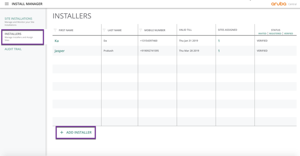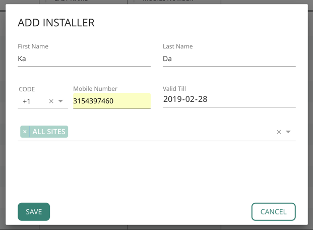 Add an installer using his mobile phone on the Central UI.