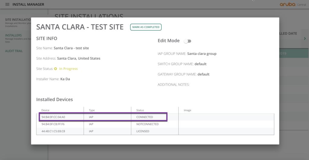 - Network admins can remotely track progress of installation of all devices at all the sites from his Install Manager view on Central UI.