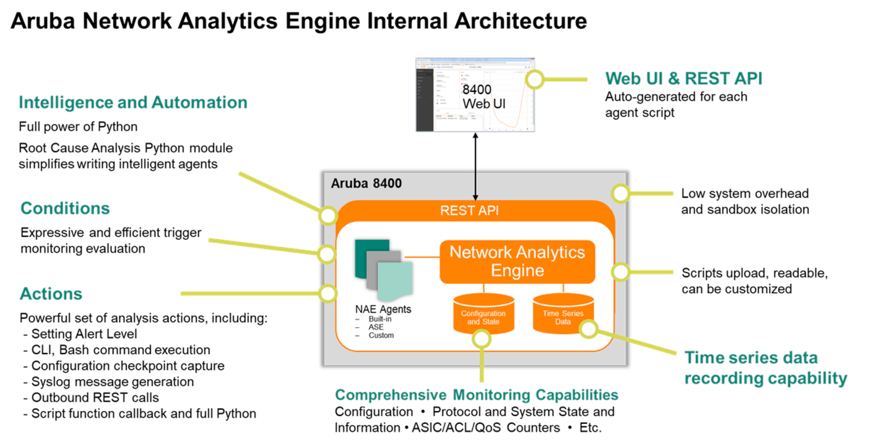 NAE是用于网络保证和补救的首个内置框架。结合了Arubaos-CX的完整自动化和深层可见性功能,这个独特的框架可以通过使用简单的脚本剂来监视,故障排除和简单的网络数据收集。