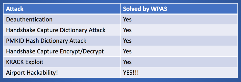 我的意思是,WPA3到底能解决什么?很高兴你发问!我做了这个方便的图表供你参考。这不是一个详尽的列表,但它确实提供了一些更令人兴奋的片段。更不用说,在WEP/WPA/WPA2景观中,我不能准确地说“是”,所以很高兴能够对出口说“是”!