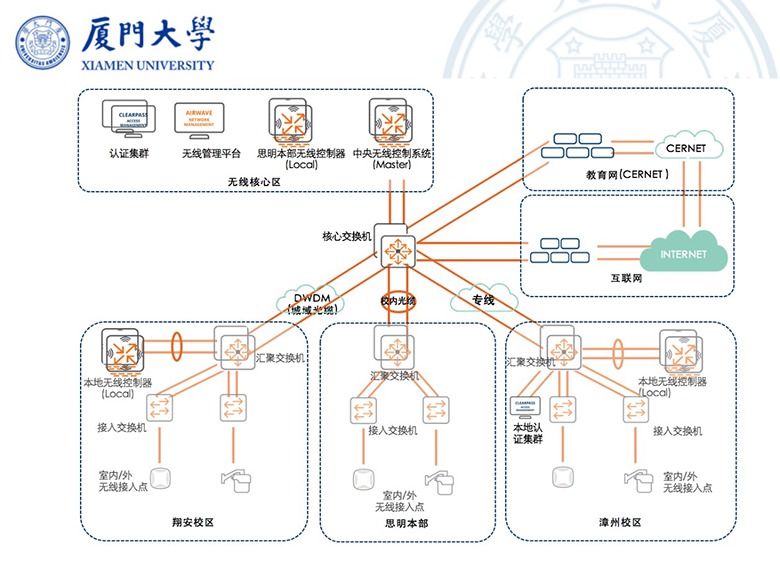 厦门大学的校区分为思明、翔安及漳州校区,需要WLAN系统以思明本部为主体,实现跨地域多校区的无线校园网;因无线覆盖所提供的移动性,在无线的接入需要依据不同类别用户的接入场景进行场景化的接入控制,如实现本校师、生、交换生、学术交流学者及访客给予便利及符合安全要求的接入控制。对于管理一张如此复杂的无线网络,要求无线方案为成熟、稳定、高容量、高冗余的无线系统,更需要提供便利管理的解决方案,实现便利、轻量化的运维。